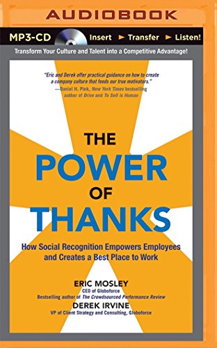2 of 3 people found the following review helpful. Valuable Insights about Employee Recognition By John Chancellor Employee recognition is one of the most valuable tools a company can employ to engage its workforce. While saying “Thank You” is a good first step, it is not sufficient.Eric Mosley and Derek Irvine, authors of The Power of Thanks – How Social Recognition Empowers Employees and Creates a Best Place to Work, have written a valuable resource for CEOs and HR heads that truly want to experience the Power of Thanks.The authors start with a strong premise, “At the heart of great corporate successes and failures is a single observable phenomenon: the behaviors and values that constitute a company’s culture largely determine its fate.” Is your company’s culture one of thanks?The book is divided into three parts. Part one deals with “Understanding Organizational Culture”. Part two focuses on “Understanding Social Recognition” and Part three covers “Putting Social Recognition into Practice.”Why is The Power of Thanks important? “Bain & Company in 2006 found that only 15 percent of companies had a high performance culture.” “A Globeforce 2012 survey found that 83% of employees departing a company rated culture as important in looking for new job; only 45% of departing employees feel their old company had a positive culture.”So while most CEOs and HR heads acknowledge the importance of corporate culture and employee engagement, clearly there is some disconnect that results in the poor numbers that are shown in study after study on employee engagement.Mosley is the CEO of Globoforce and Irvine is VP of Client Strategy. Globoforce is a world-renowned firm specializing in employee recognition. The firm has an impressive list of clients that have benefited from their work.The authors write in business conversational style, using plenty of examples from their client companies as well as citing numerous surveys and studies. There are valuable insights to be gained from what has worked and why it worked.There are some valuable checklist in Part 3, including “Eight fatal signs of a poor recognition program”, “A guide to recognition moments” and “A pocket summary of best practices.” There are also many “Mythbuster” highlighted text boxes where the authors dispel some popular myths about employee recognition.With the product/service difference becoming more and more difficult to maintain, the most competitive advantage a company can have is its employees. But just hiring the best and the brightest will not translate into a competitive advantage. You need the right culture. You need employees that are engaged and feel appreciated. You must cultivate the culture. It does not happen without strategic management. This book is an excellent guide to help CEOs and HR heads understand and implement a culture of recognition.I was provided a review copy of this book.