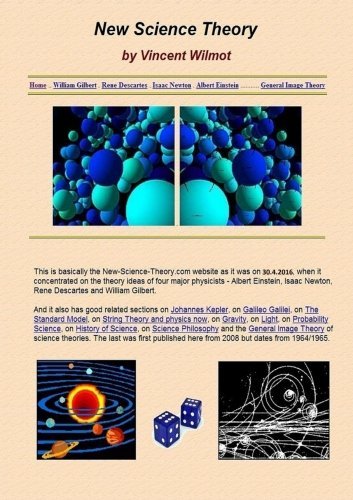 New Science Theory by Vincent Wilmot is basically the New-Science-Theory.com website as on 1.1.2012 - for changes since visit the site with a Sitemap noting updates. Especially good for those interested in physics, it concentrates chiefly on the four great physicists Albert Einstein, Isaac Newton, Rene Descartes and William Gilbert. Also here are fine sections covering Galileo, Kepler, History of Science, Philosophy of Science, Gravity, Light, Standard Model, String Theory, Probability Science and General Image Theory. A 2015 version is available from Amazon.co.uk or from LULU.com which also has an ebook.